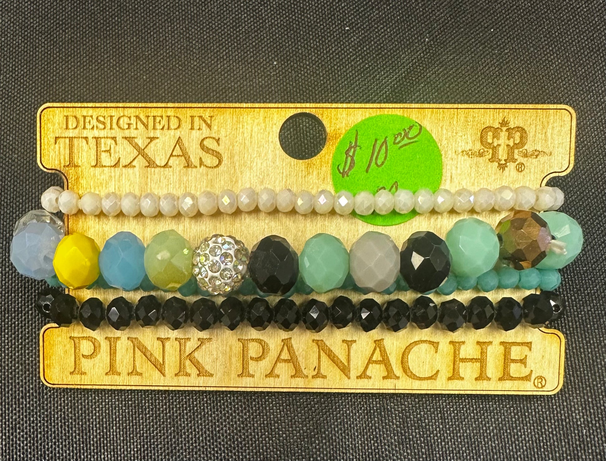 A set of four bracelets combining black, white, and turquoise beads in a stylish stack.